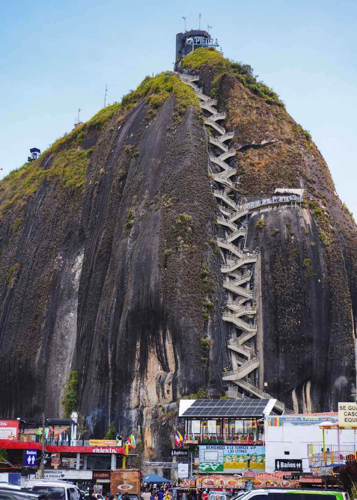 Schon von weitem können wir den Monolith bestaunen… und die dazugehörigen 724 Stufen, die zum Gipfel hinaufführen. Beim Anblick dieser Stufen haben wir tapfer auf den Aufstieg verzichtet, schliesslich ist Guatape auch für den Stausee und für die überaus bunten Häuser und Sockel bekannt. Und bunt ist es.