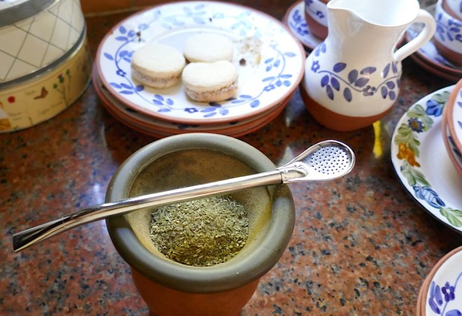 Die Gauchos haben von den Ureinwohnern den Brauch übernommen, Mate zu trinken. Von ihnen stammt auch das Ritual, das Getränk mit Anwesenden zu teilen, auch der Trinkhalm. Es wird getrunken und in der Gruppe weitergereicht. Einige Male konnten wir dies beobachten, aber heutzutage scheint dieser Brauch ein wenig zu verblassen, meistens hat zumindest jedes Paar eine eigene „Ausrüstung“
