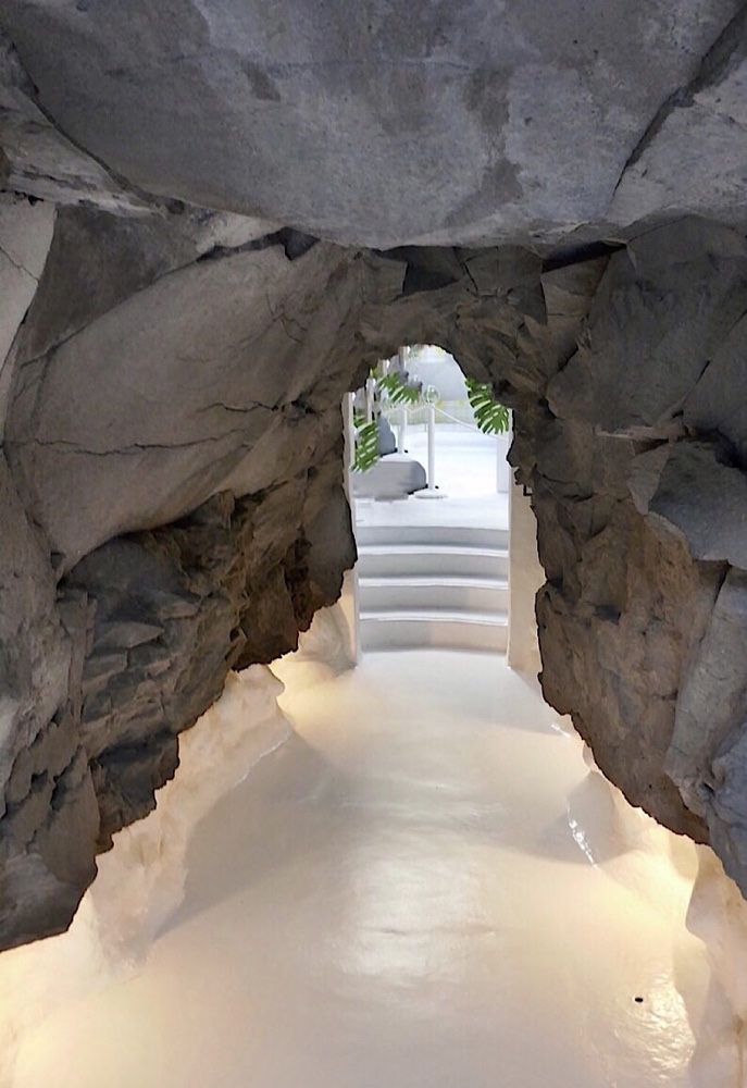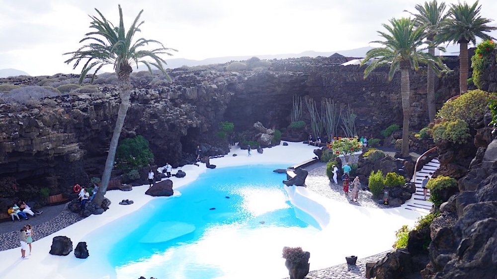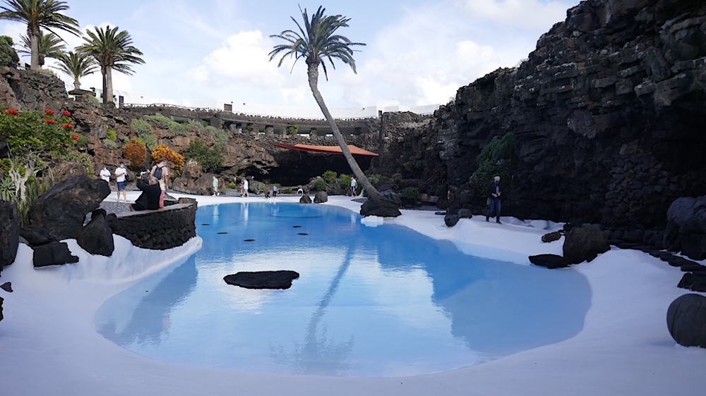 Der Kontrast zwischen Lavahöhlen und dem blendend weiss gestrichenen Pool im „Jameo grande“ könnte nicht grösser sein. Am liebsten würde man sich ins klare Wasser legen, deshalb wohl der Hinweis „Baden verboten“.