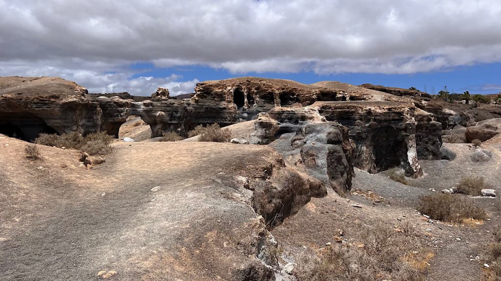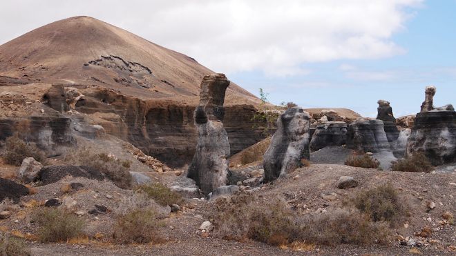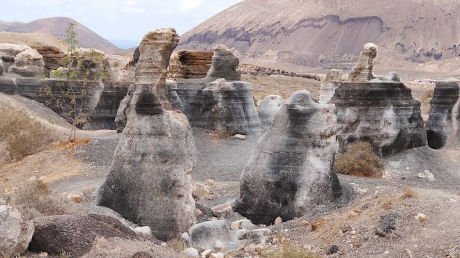 Das Gelände des Steinbruchs ist sehr weitläufig und überall wo Vulkanasche abgebaut wurde, klaffen riesige Gruben in der Erde. Seit Jahrzehnten ist die Rofera der Witterung ausgesetzt, der starke Wind, der Regen und auch die Trockenheit formten und formen diese porösen und brüchigen Felsen und Steine zu bizarren Formationen. Und heute kommen ausser den Besuchern leider auch Kolonnen von Sandbuggys hinzu, die den Steinbruch als Tummelplatz benutzen und auch ihre Spuren hinterlassen.