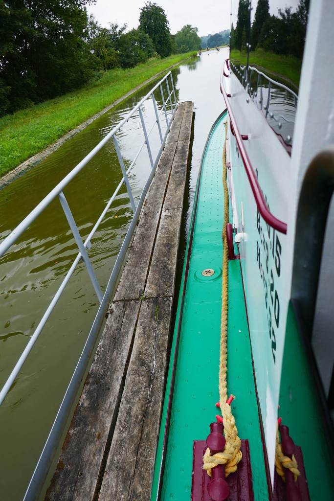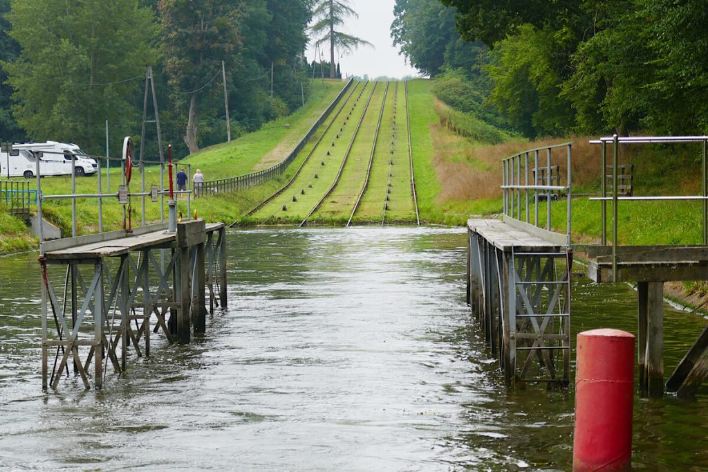 Und das System ist eigentlich ganz einfach, das Schiff schiebt sich auf eine unter Wasser liegende Plattform, wird mit Seilen angemacht und auf ein Signalton des Kapitäns setzt der Maschinist, der in einem Häuschen neben dem Kanal sitzt, das Räderwerk in Bewegung. Stück für Stück zieht ein dickes Stahlseil die Plattform mitsamt Schiff aus dem Wasser. Ist der Gipfel erreicht, geht es Huckepack auf Schienen den Hang hinauf oder – in unserem Fall – den Hang hinunter.