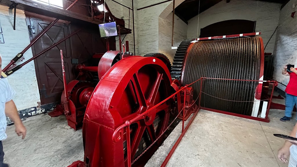 In Katy durften wir in das Maschinenhaus und der Maschinist hat uns erklärt, wie das ausgeklügelte System funktioniert, scheinbar schwerfällig aber präzise wie ein Uhrwerk. Über ein Rohr wird Wasser aus dem Kanal auf ein acht Meter großes Wasserrad geleitet, dessen breite Schaufeln je eine Tonne Wasser aufnehmen. Das Wasserrad bewegt ein Endlos-Seil, dieses wiederum bringt die Plattform in Fahrt. Eigentlich ganz einfach, ähnlich wie eine Standseilbahn.