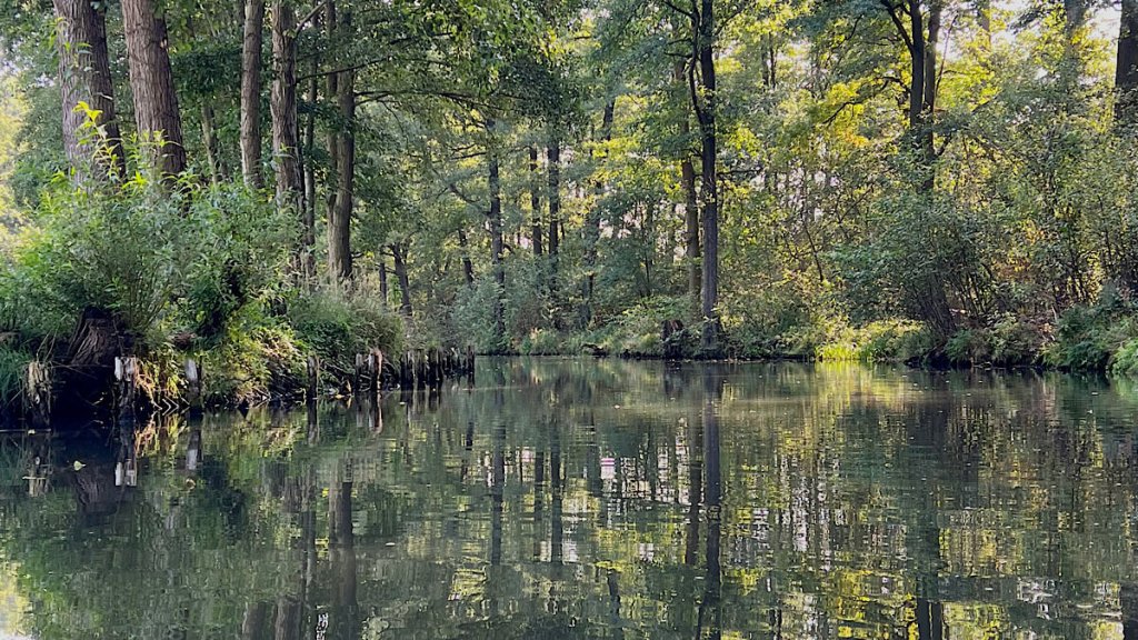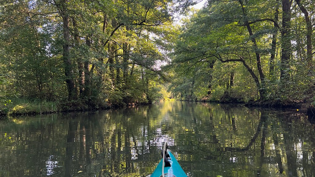 Doch am schönsten war unsere Kajaktour am letzten Freitag Vormittag. Kaum an Lehde vorbeigezogen hatten wir die Hauptspree bis nach Leipe ganz für uns alleine. Der Fluss fliesst so langsam, dass auch das Paddeln gegen den Strom kaum Mühe bereitet. Die Stille wird selten unterbrochen, ein springender Fisch, eine Ente die schnattert, ein Windstoss in den Baumkronen… einfach nur wunderbare Stille.