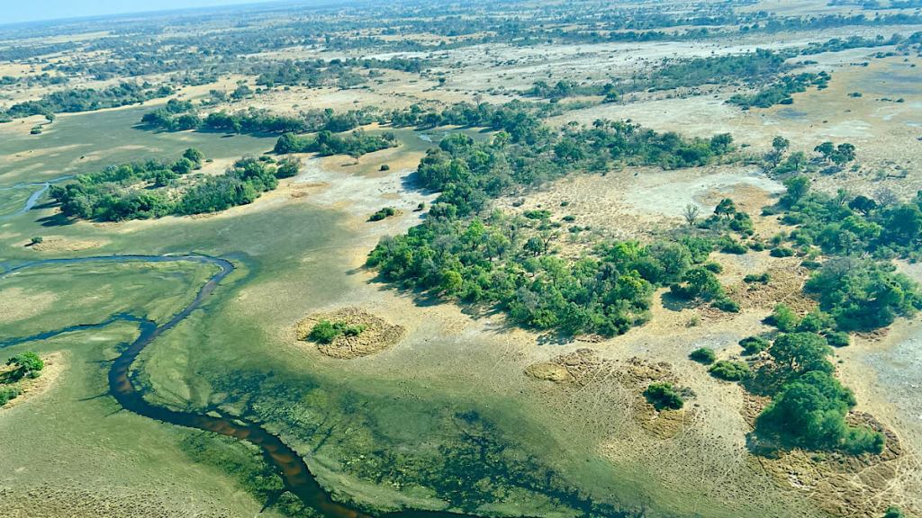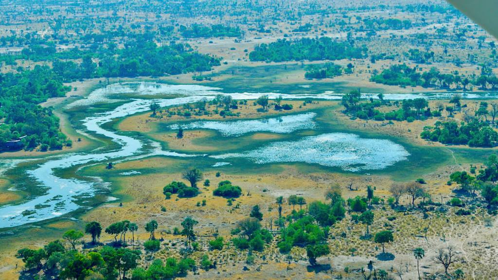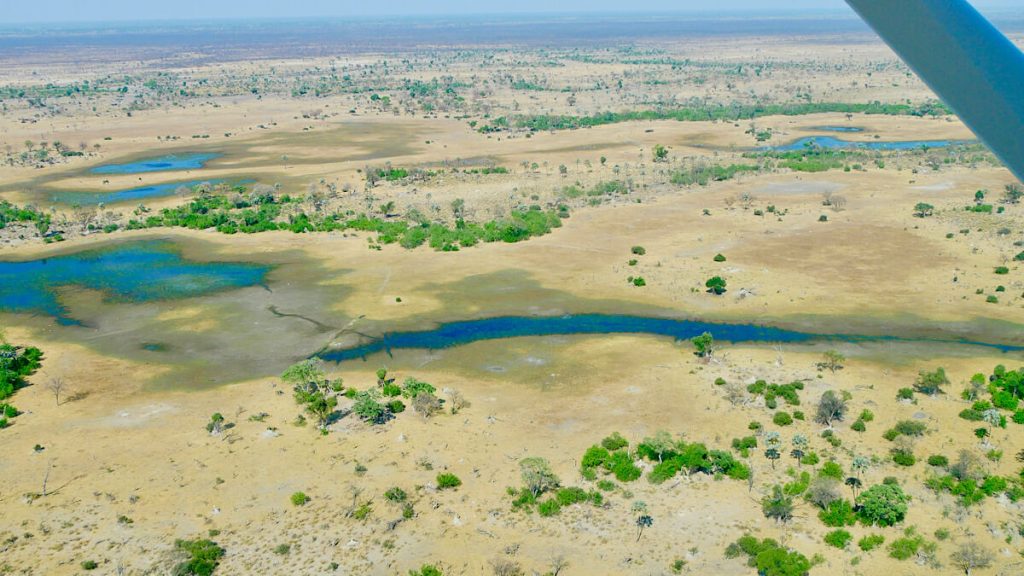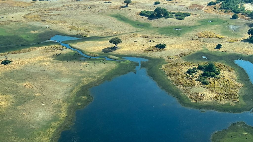 Im Okavango-Delta fächert sich der Okavangofluss auf und versickert im Kalaharibecken bzw. verdunstet zu grossen Teilen. Dabei bildet er inmitten der semi-ariden Kalahari mit über 20 000 Quadratkilometern eines der größten und tierreichsten Feuchtgebiete Afrikas. (Quelle: Wikipedia)