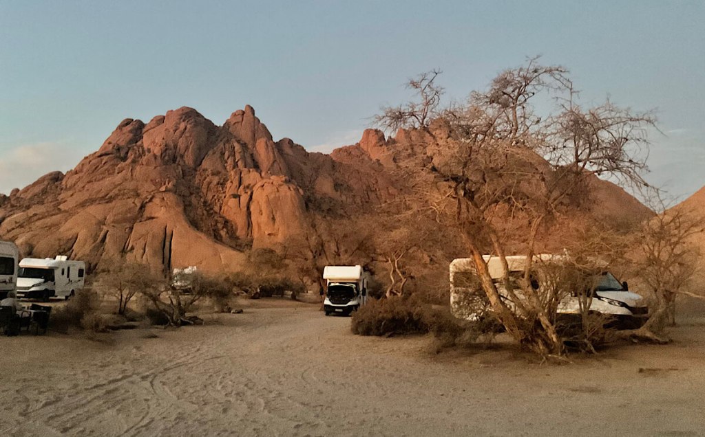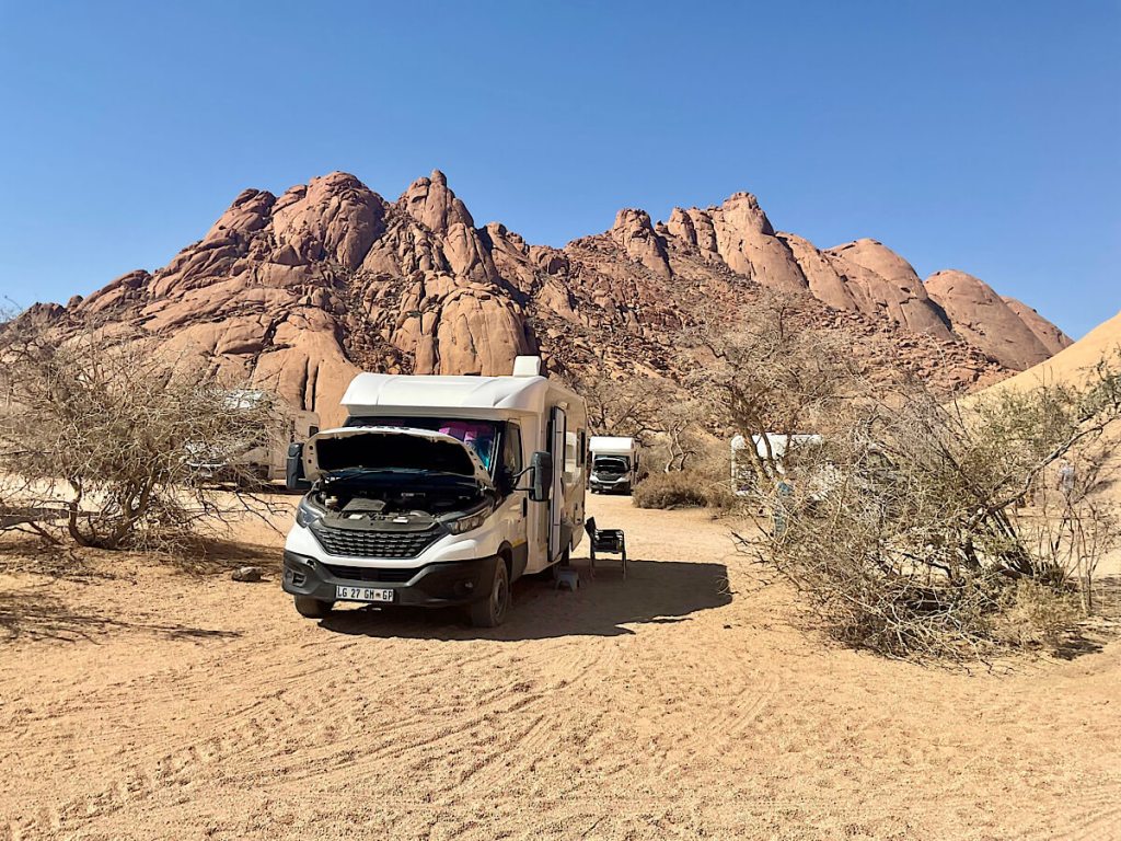 Spitzkoppe liegt ca. 120 km von Swakopmund, wo wie heute angekommen sind, entfernt. Hier bleiben wir drei Nächte. Die Ruhepause tut gut, und auch an den Fahrzeugen muss einiges wieder repariert werden. Dem Mechaniker geht die Arbeit nicht aus, bei unserem Fahrzeug hat er z.B. gerade die Stossdämpfer ausgetauscht.