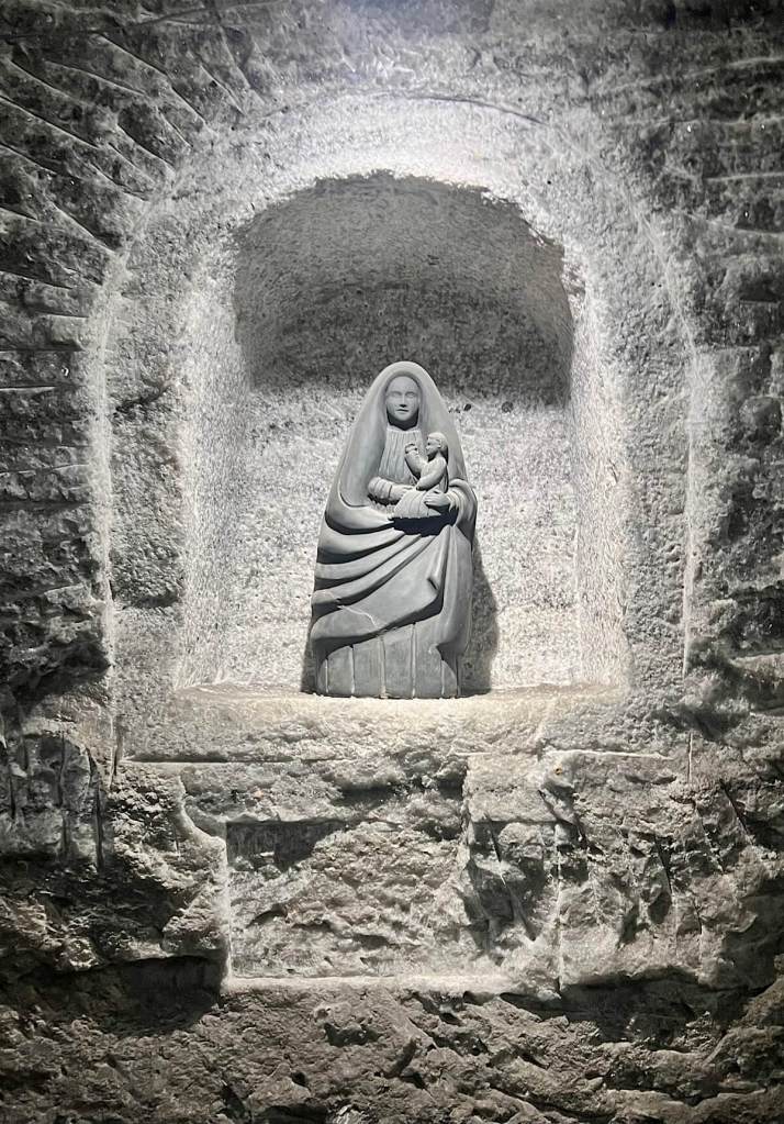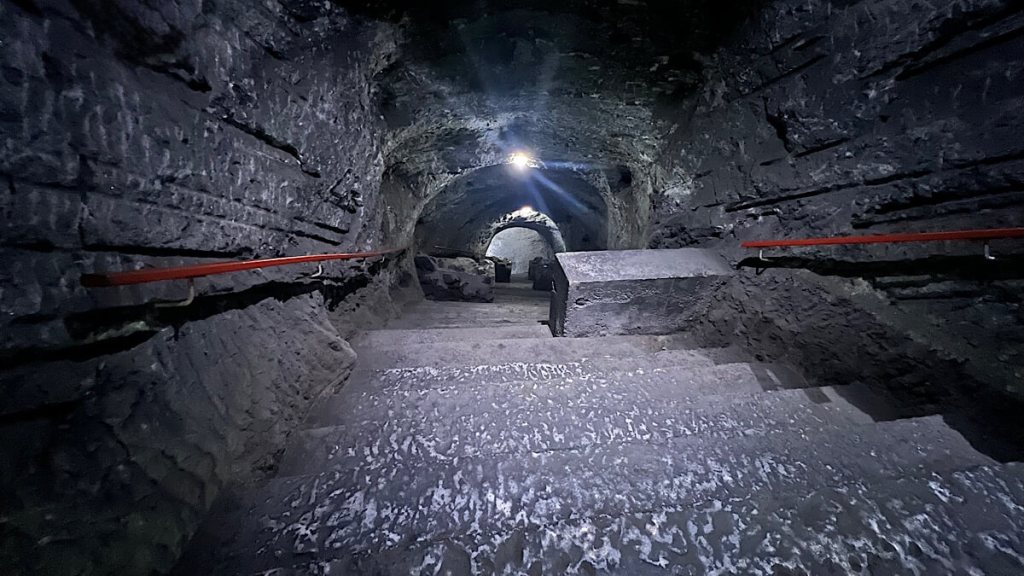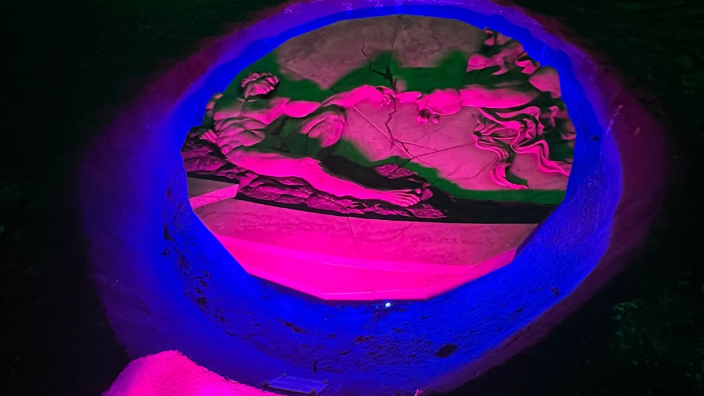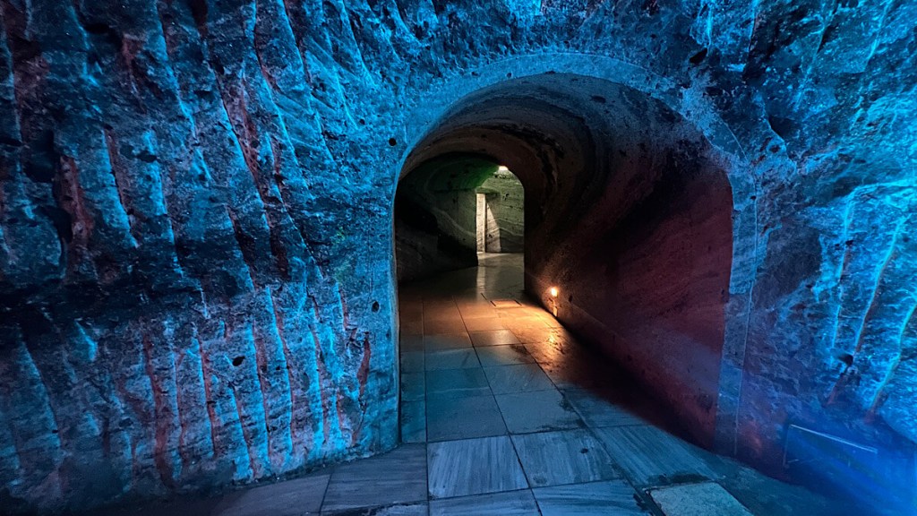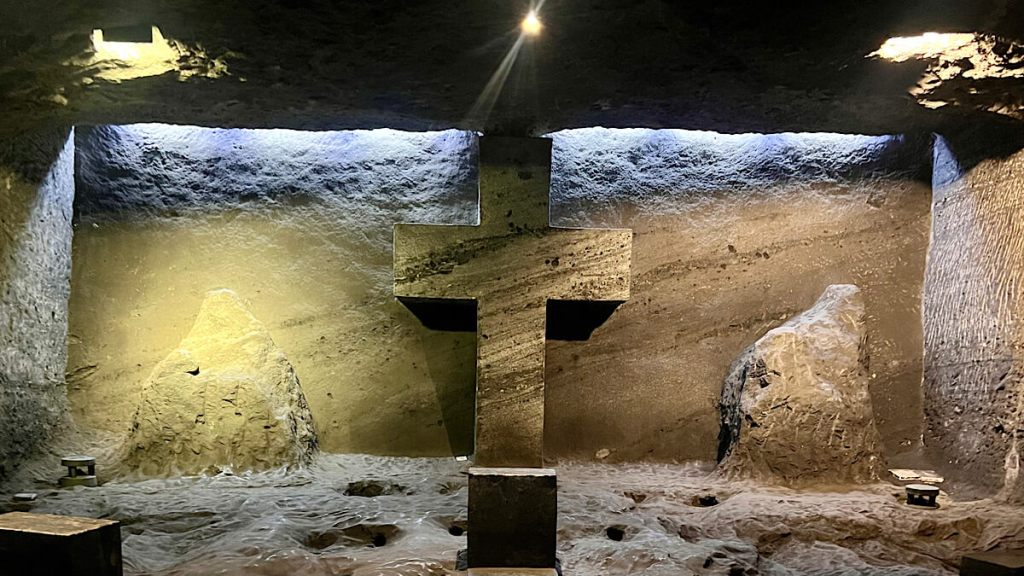 Der Zugang erfolgt über einen Tunnel mit 14 Kapellen, die die Stationen des Kreuzwegs darstellen und durch beeindruckende Licht- und Farbeffekte in Szene gesetzt werden.